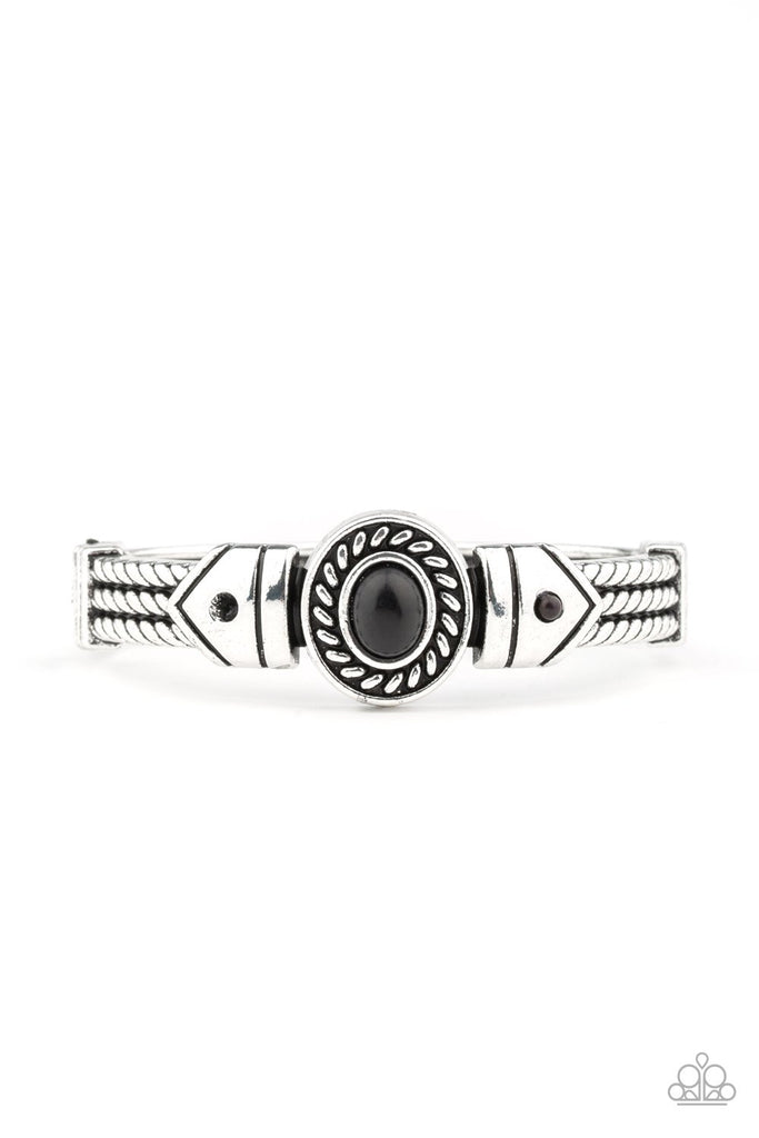 Featuring metallic rope-like patterns, an ornate bangle-like cuff curls around the wrist. Smooth black stones dot the center of the ornate frame for a seasonal flair. Features a hinged closure.