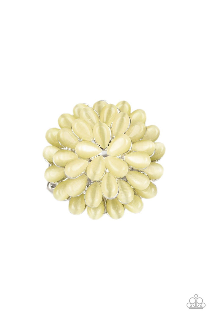 Row after row of teardrop cat's eye stones stack into a blast of yellow petals atop the finger, creating a whimsical blossom. Features a stretchy band for a flexible fit.