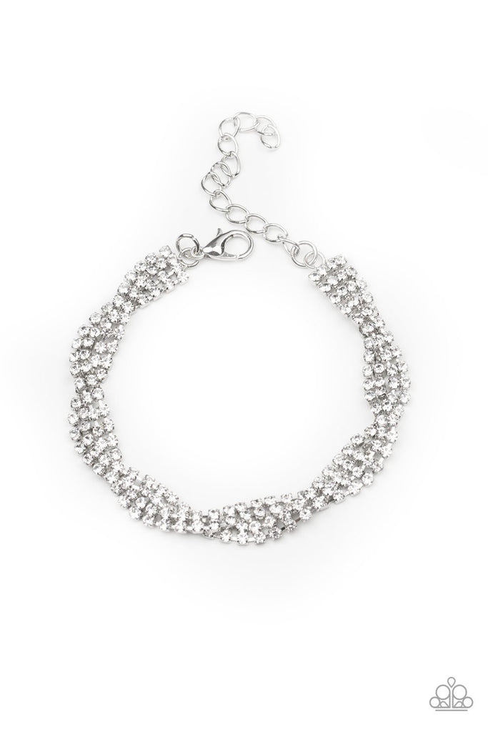 Infused with glistening silver fittings, strands of glassy white rhinestones delicately braid across the wrist in timeless fashion. Features an adjustable clasp closure.