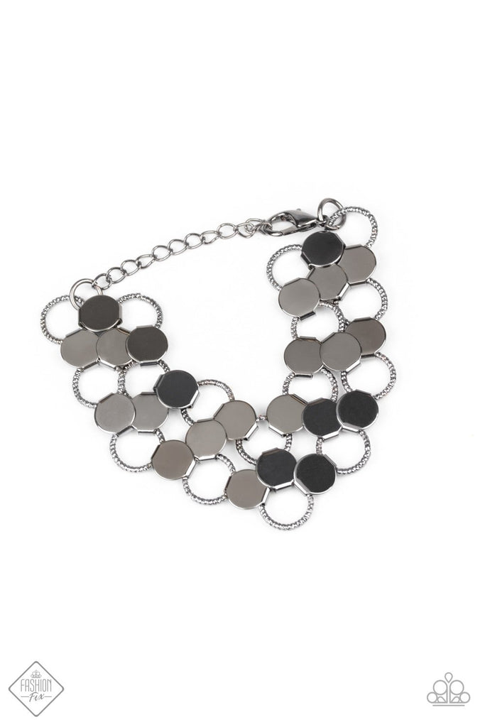 Dotted with reflective gunmetal discs, an interlocking net of textured gunmetal rings link into edgy netted layers around the wrist. Features an adjustable clasp closure.