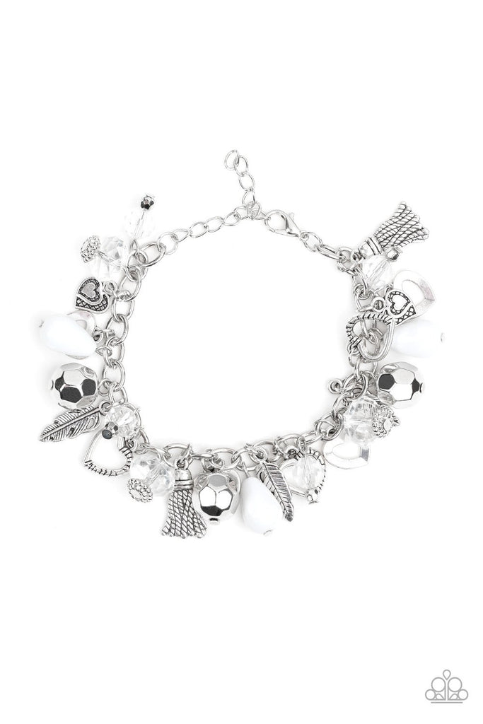 A collection of white crystal-like, white teardrop, and faceted silver beads join a variety of shimmery silver charms around the wrist for a whimsical look. Features an adjustable clasp closure.