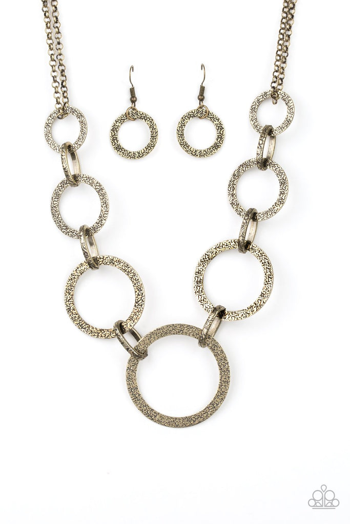 Delicately hammered in antiqued shimmer, glistening brass hoops connect with ornate links below the collar for an edgy look. Features an adjustable clasp closure.