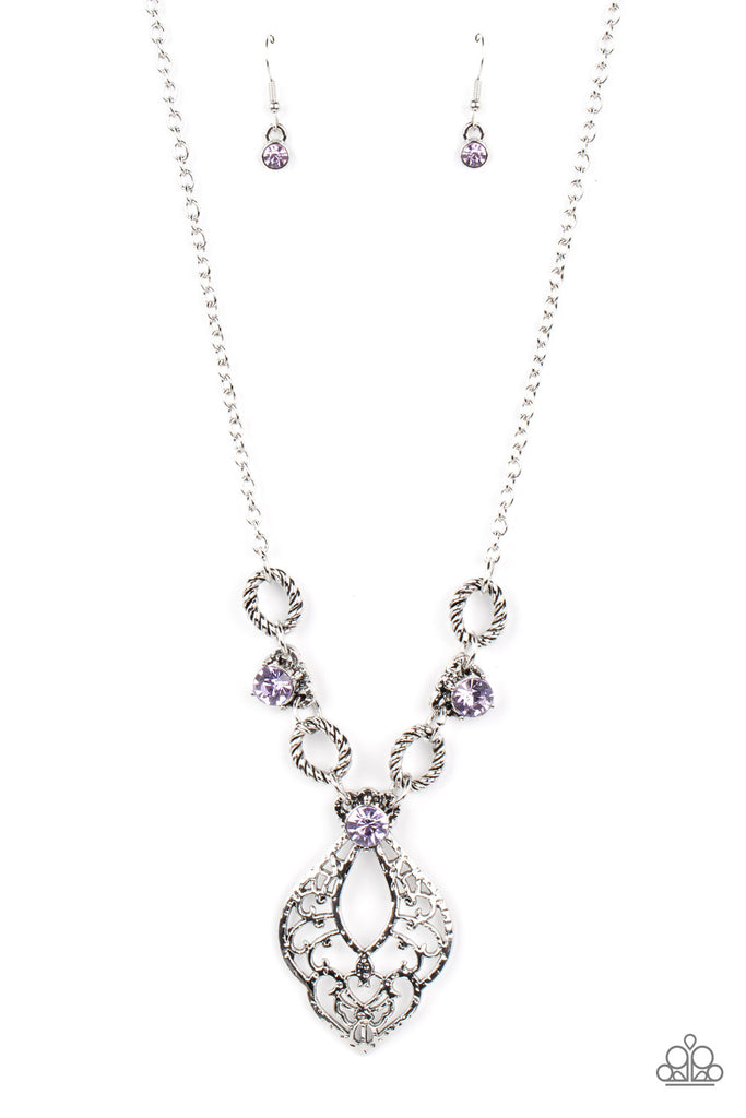 Twisted silver links and oversized purple rhinestones delicately alternate below the collar. A hammered filigree filled silver pendant shimmers from the bottom of the centermost rhinestone, creating a contemporary pendant. Features an adjustable clasp closure.