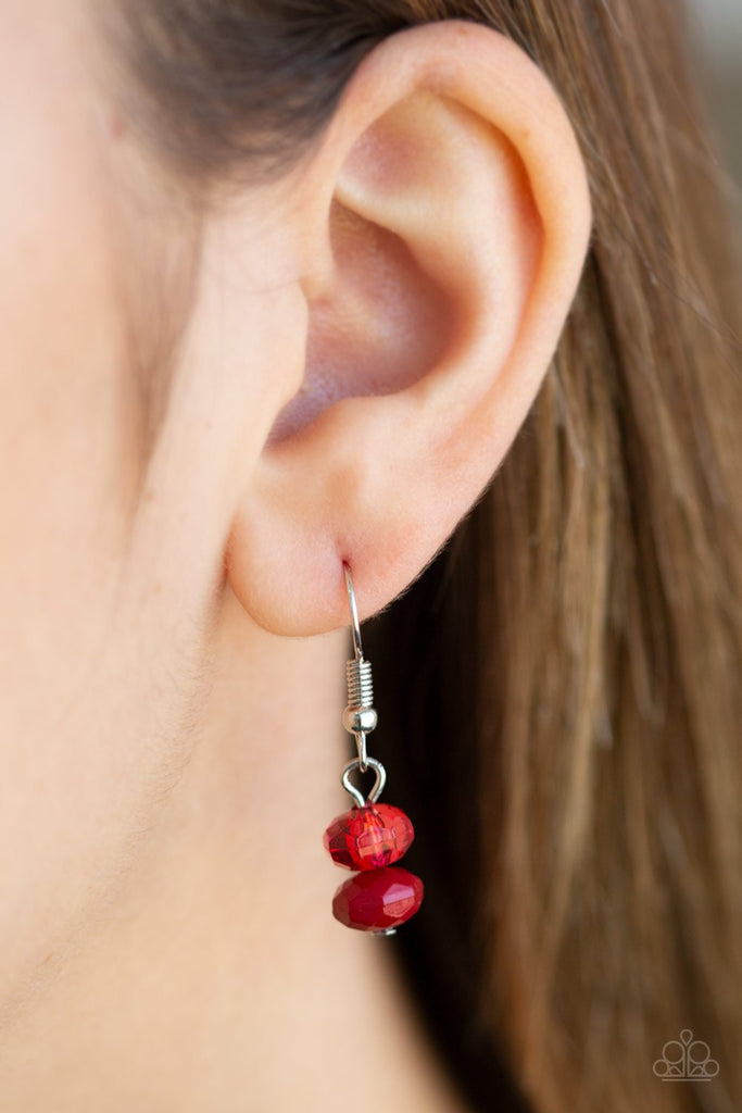 A collection of polished, glassy, and oversized red beads trickle along two shimmery silver chains down the chest, creating colorfully refined layers. Features an adjustable clasp closure.