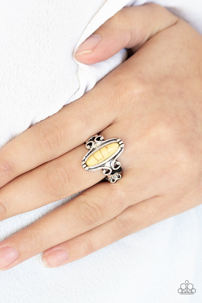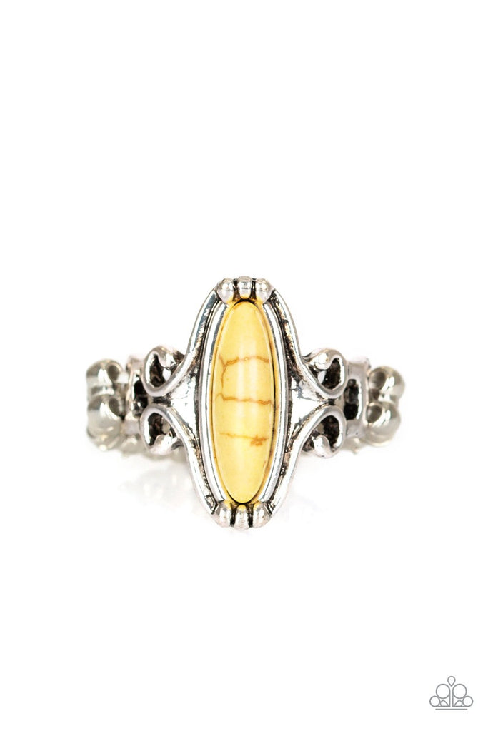 A dainty yellow stone bead is pressed into the center of an antiqued silver frame radiating with glistening filigree for a seasonal look. Features a dainty stretchy band for a flexible fit.