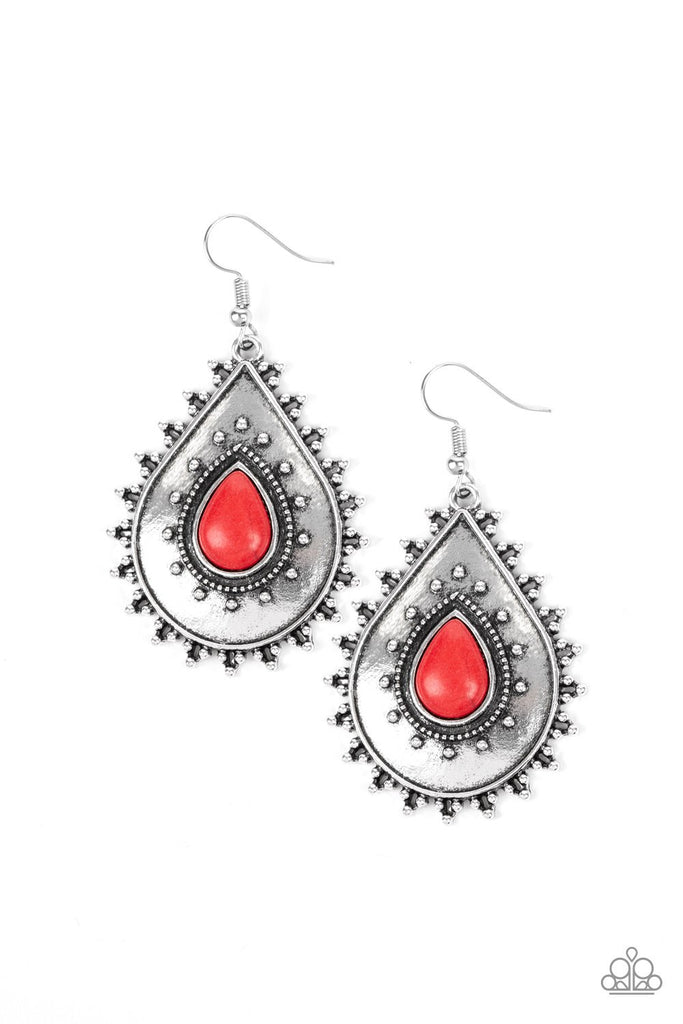 Chiseled into a tranquil teardrop, a fiery red stone is pressed into the center of an antiqued silver teardrop dotted in shimmery silver studs for a seasonal look. Earring attaches to a standard fishhook fitting.