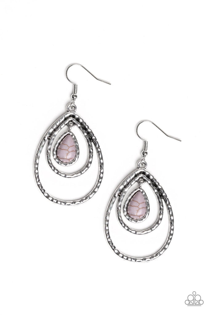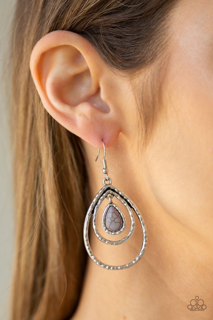 Nestled inside of a hammered silver frame, a dainty gray stone teardrop swings from the top of a doubled silver teardrop frame for an abstract look. Earring attaches to a standard fishhook fitting.