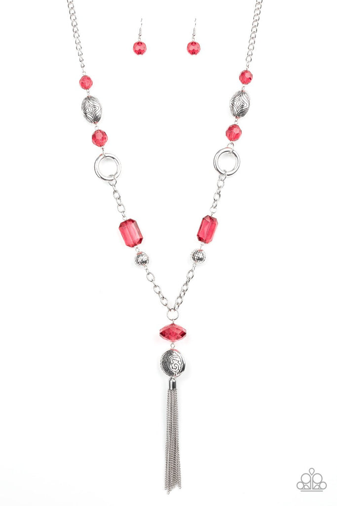 A collection of glassy red crystal-like beads, shimmery silver hoops, and ornate silver beads link across the chest. A shimmery silver tassel streams from the bottom of a whimsical compilation for an enchanting finish. Features an adjustable clasp closure.