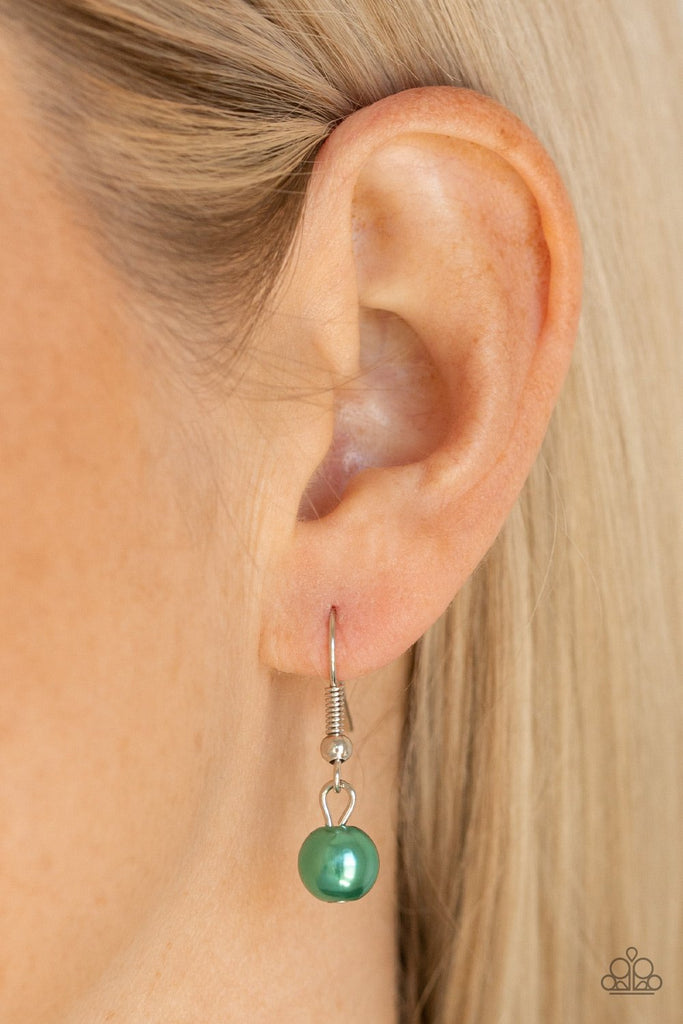 A refined collection of glistening silver and pearly green beads swing from the bottom of shimmery silver chains, creating glamorous layers below the collar. Features an adjustable clasp closure.