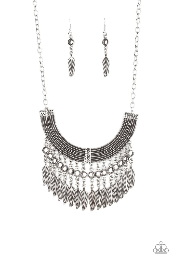 Shimmery silver feather charms dangle from the bottom of a bowing silver frame, creating a ferocious fringe below the collar. Features an adjustable clasp closure.