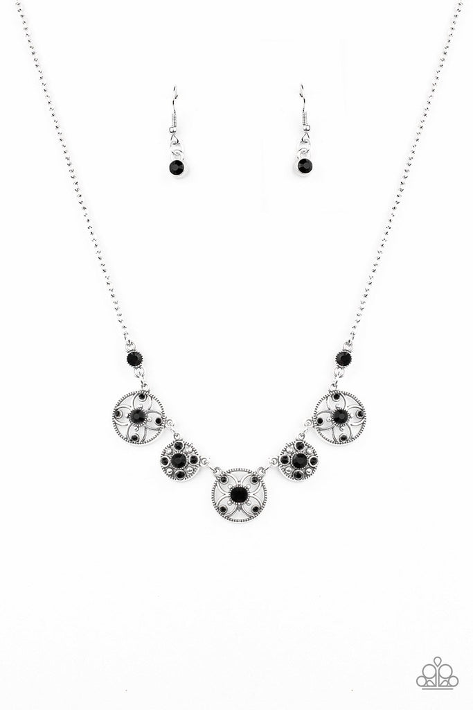 Dotted with glittery black rhinestones and dainty silver studs, flowery medallion-like frames link below the collar for a whimsical look. Features an adjustable clasp closure.