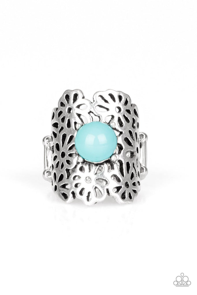 A collection of airy silver flowers coalesce into a thick silver band. A polished blue bead dots the center, adding a perfect pop of color to the seasonal piece. Features a stretchy band for a flexible fit.