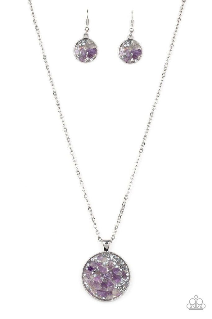 Infused with metallic and glassy white rhinestone prisms, bits of purple rock and dainty silver beads are sprinkled along the center of a round silver frame, creating a glittering pendant below the collar. Features an adjustable clasp closure.