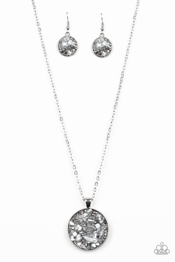 Infused with smoky and glassy rhinestone prisms, bits of metallic rock and dainty silver beads are sprinkled along the center of a round silver frame, creating a glittering pendant below the collar. Features an adjustable clasp closure.