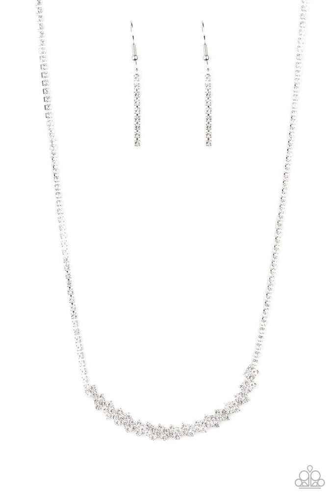 A dainty strand of glittery white rhinestones attach to a bowing pendant encrusted in blinding white rhinestones, creating a glitzy look below the collar. Features an adjustable clasp closure.
