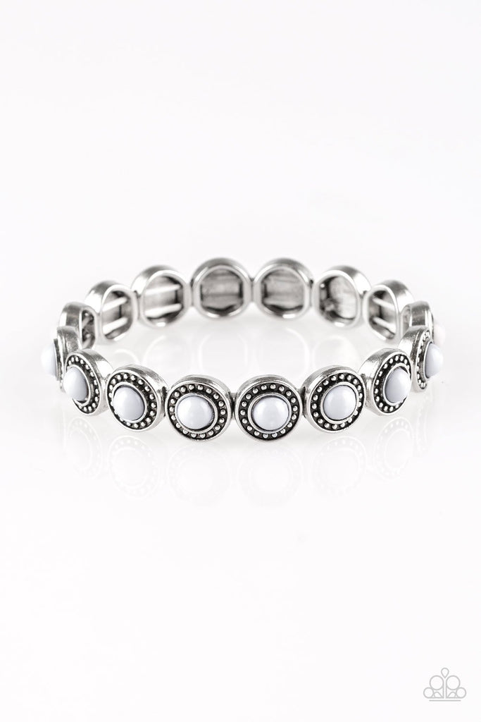 Dotted with neutral gray beaded centers, studded silver frames are threaded along stretchy elastic bands and linked around the wrist for a whimsical look.