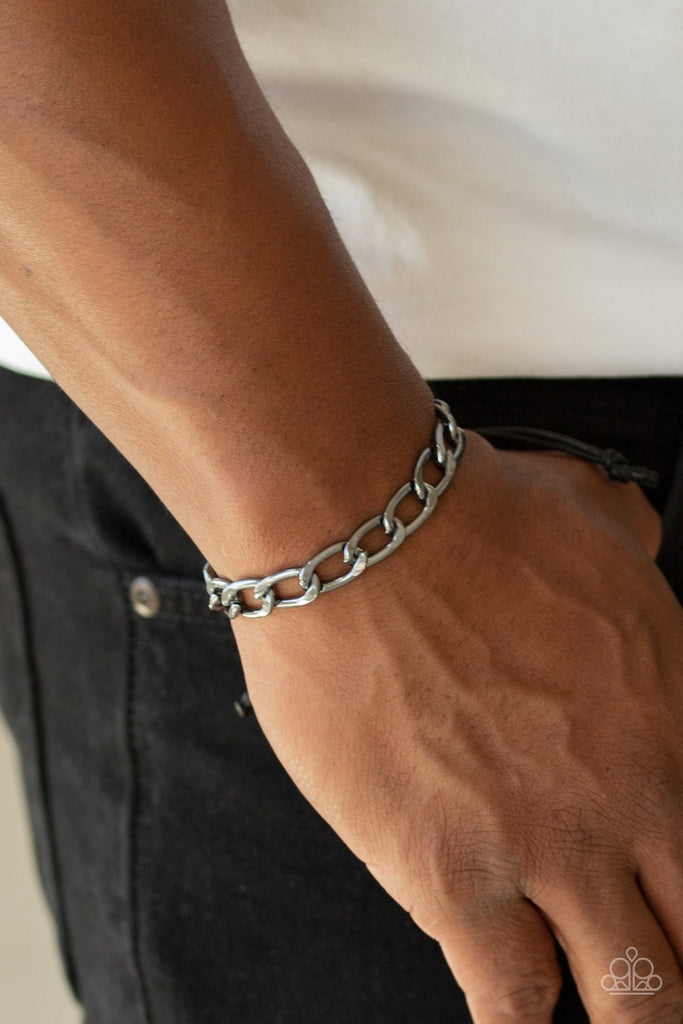 Shiny black cording knots around the ends of a gunmetal beveled cable chain that is wrapped across the top of the wrist for a versatile look. Features an adjustable sliding knot closure.