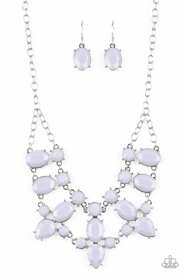 A collision of round, oval, and teardrop gray beaded frames delicately connect below the collar for a glamorous look. Features an adjustable clasp closure.