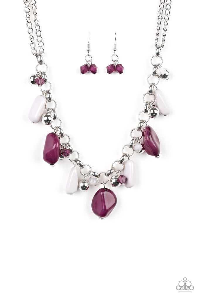 Featuring polished and cloudy finishes, a collection of purple and gray faux rocks dance from the bottom of a bold silver chain. Classic silver beads trickle between the colorful beading, adding a metallic shimmer to the whimsical fringe. Features an adjustable clasp closure.