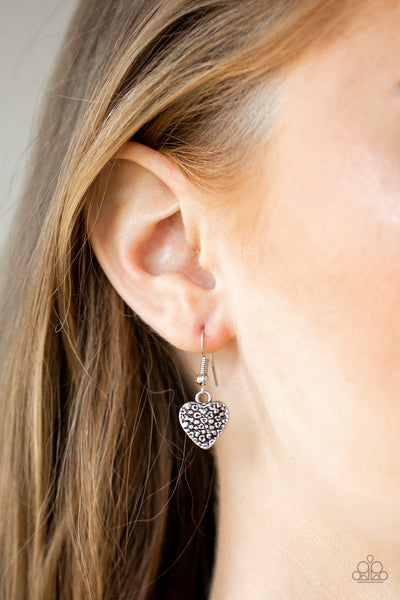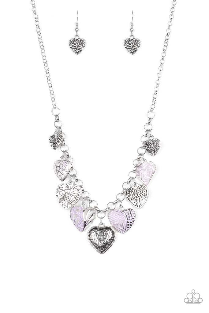 Featuring an array of floral patterns, a collection of silver hearts swing from the bottom of a shimmery silver chain. Alternating charms are brushed in a shiny purple finish, creating a colorful fringe below the collar. Features an adjustable clasp closure.