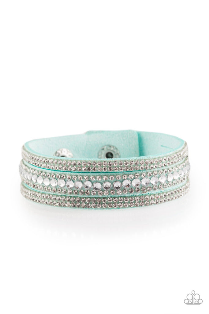 Varying in size, glittery white rhinestones are encrusted along a blue suede band that has been spliced into three glittery strands. Features an adjustable snap closure.