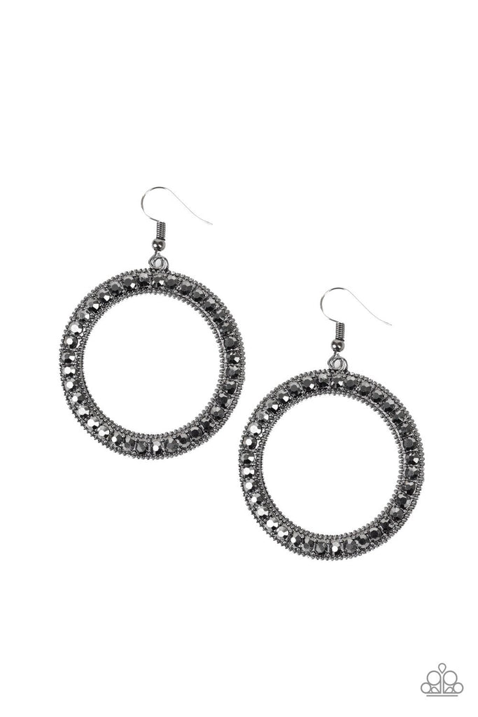 Encrusted in a glittery ring of hematite rhinestones, a studded gunmetal hoop swings from the ear for a dramatic look. Earring attaches to a standard fishhook fitting.