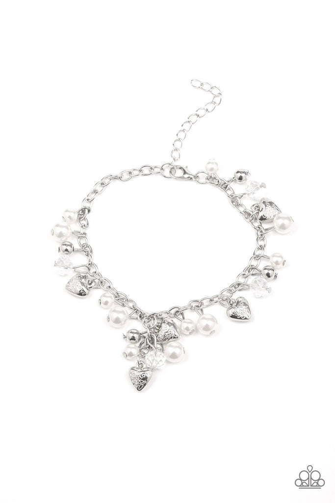 A charming collection of white pearls, glassy crystal-like beads, and ornate silver heart charms dangle from the wrist, creating a flirtatious fringe. Features an adjustable clasp closure.