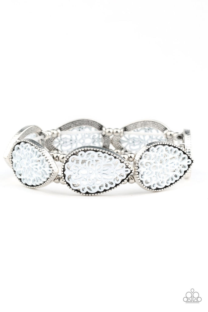 Painted in a shiny white finish, filigree filled teardrop frames and shiny silver beads are delicately threaded along a stretchy band around the wrist for a vintage inspired look.
