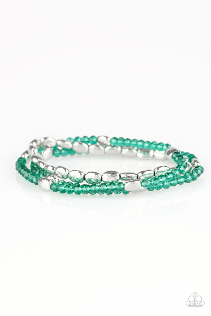 Infused with hints of silver, dainty green crystal-like beads are threaded along stretchy bands, creating whimsical layers across the wrist.