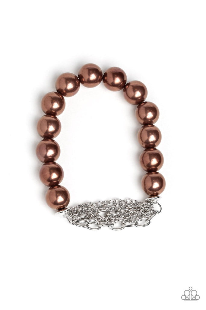 Infused with a section of mismatched silver chains, a refined collection of pearly brown beads and dainty silver rings are threaded along a stretchy band around the wrist for a glamorous finish.