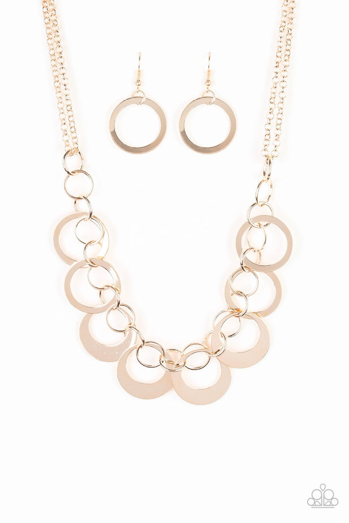 A collection of rose gold links and shiny rose gold hoops connect below the collar, creating a refined fringe. Features an adjustable clasp closure.