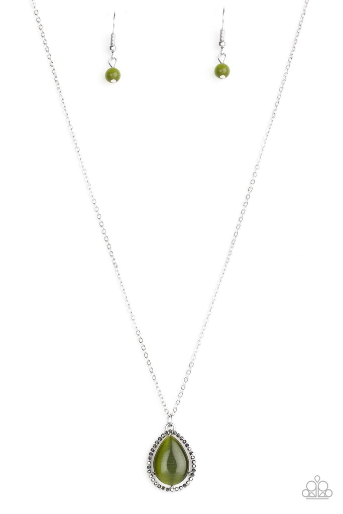 A green teardrop cat's eye stone is nestled inside a dainty hematite rhinestone encrusted frame, creating a glamorous pendant below the collar. Features an adjustable clasp closure.