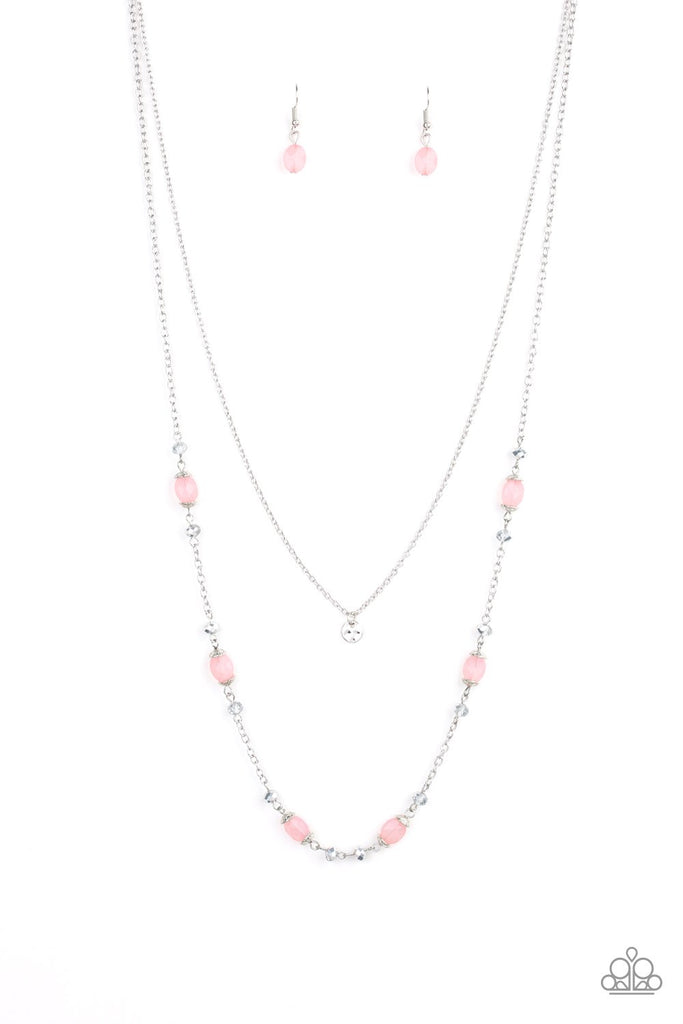 A dainty hammered disc is suspended above a glistening silver chain sparkling with dainty silver accents, metallic crystal-like beads, and opaque pink beads for a whimsical look. Features an adjustable clasp closure.
