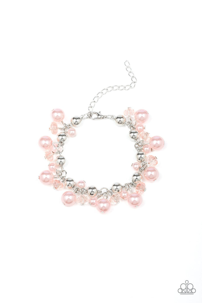 A refined collection of silver beads, pink pearls, and pink crystal-like beads cluster around the wrist, creating a timeless fringe. Features an adjustable clasp closure.