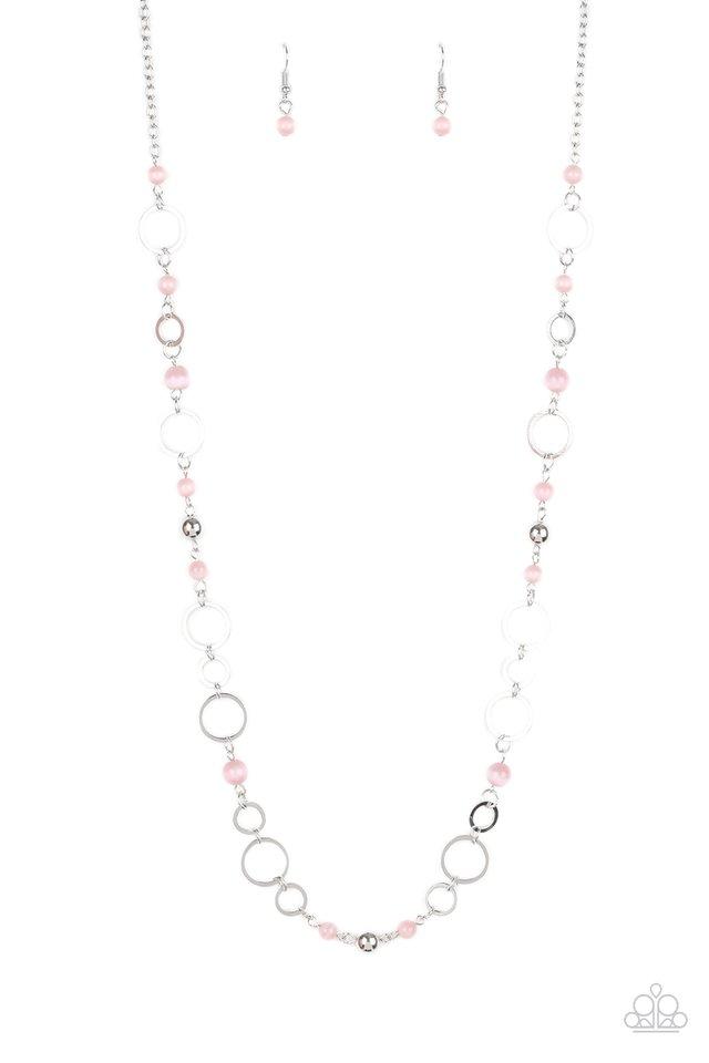 Shimmery silver hoops and glowing pink moonstone beads connect into a whimsical chain across the chest. Features an adjustable clasp closure.