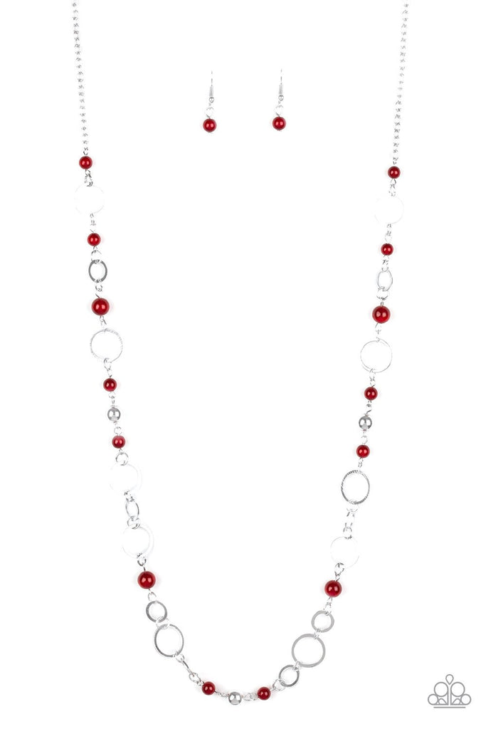 Shimmery silver hoops and glowing red moonstone beads connect into a whimsical chain across the chest. Features an adjustable clasp closure.