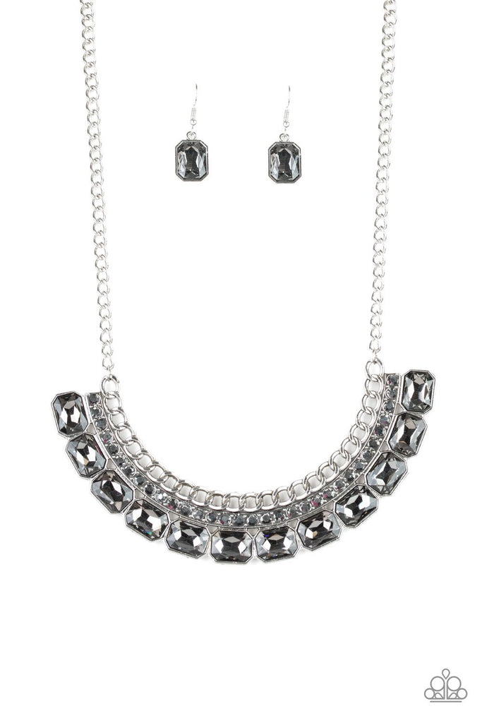 Stationary rows of shimmery silver chain, glittery hematite rhinestones, and smoky emerald-cut gems coalesce into a bold pendant below the collar. Features an adjustable clasp closure.