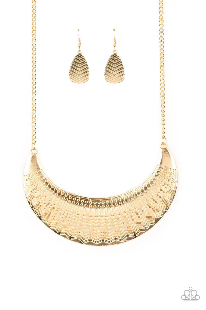 Stamped in an assortment of geometric patterns, an oversized gold half-moon pendant swings below the collar for a bold tribal style. Features an adjustable clasp closure.