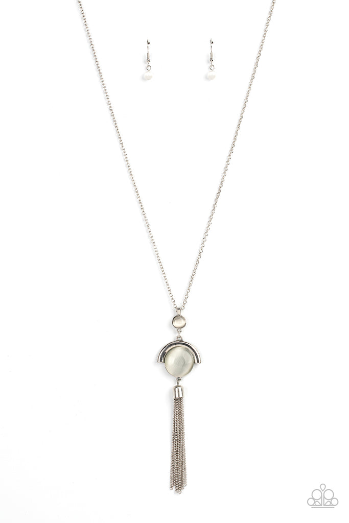 Infused with a curved silver bar, an oversized white cat's eye stone pendant links between a silver chain tassel and dainty white cat's eye stone fitting, creating a whimsically stacked tassel at the bottom of a lengthened silver chain. Features an adjustable clasp closure.