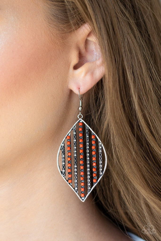 Dainty rows of faceted orange beads and chain link accents line the inside of a leafy silver frame for a seasonal flair. Earring attaches to a standard fishhook fitting.