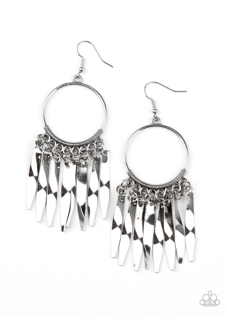 Curved silver plates dangle from the bottom of a textured silver hoop, creating a rustic fringe. Earring attaches to a standard fishhook fitting.