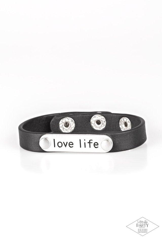 A silver plate engraved with the inspirational phrase “love life” is studded in place along a skinny strip of black leather. Brushed in a shiny finish, the dainty band wraps around the wrist in a simply seasonal style. Features an adjustable snap closure.