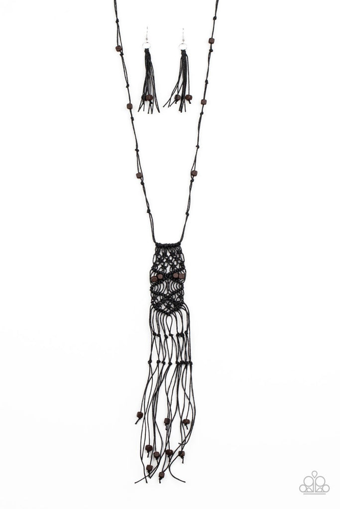 A collection of square wooden beads are knotted in place along strands of shiny black cording, adding an earthy flair to the whimsically tasseled macramé pendant at the bottom of the elegantly lengthened display. Features an adjustable sliding knot closure.