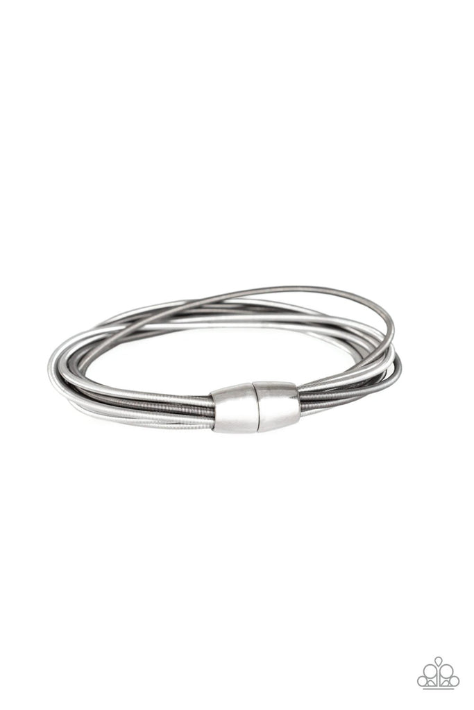 Silver and gunmetal spring-like wires layer across the wrist for a sleek industrial look. Features a magnetic closure.