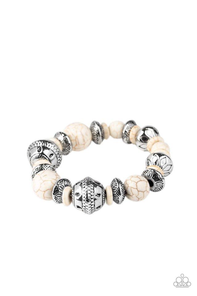 A collection of refreshing white stones and ornate silver beads are threaded along stretchy bands around the wrist for a seasonal flair.