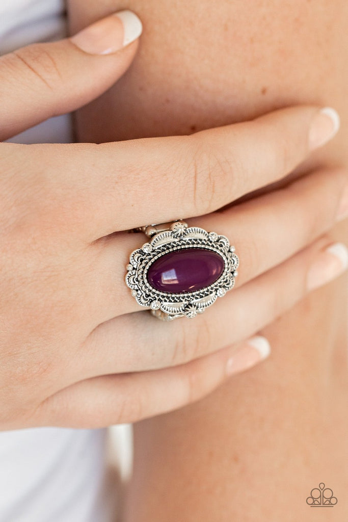 An oval plum bead is pressed into the center of an ornately scalloped silver frame, adding a majestic pop of color to any outfit. Features a stretchy band for a flexible fit.