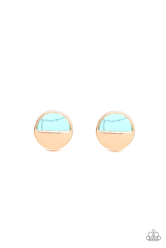 Featuring a half-moon shape, a piece of faux turquoise stone is pressed into one half of a gold disc for a sleek look. Earring attaches to a standard post fitting.