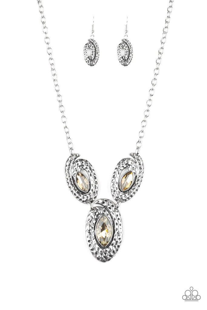 A trio of golden topaz marquise-cut rhinestones are nestled inside swirls of hammered silver frames, creating a dazzling statement piece below the collar. Features an adjustable clasp closure.