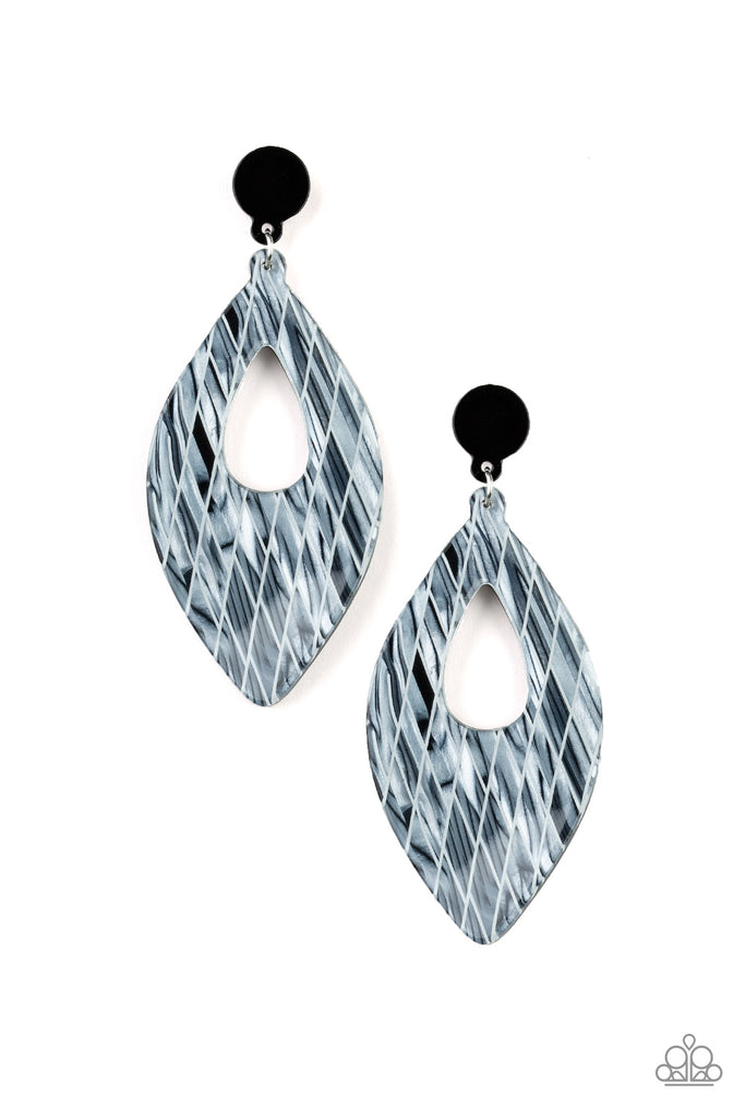 Featuring a shimmery geometric finish, an abstract acrylic lure attaches to a simple black acrylic fitting for a retro inspired look. Earring attaches to a standard post fitting.