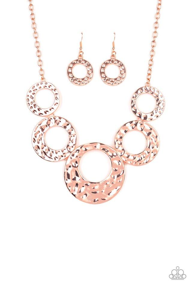 Gradually increasing in size, hammered shiny copper circles link below the collar for a statement-making look. Features an adjustable clasp closure.